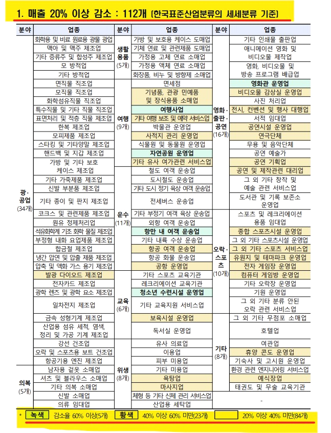 희망회복자금 경영위기업종 리스트한국표준산업분류 세세분류 기준 0 20210815. 112개 한국표준산업분류 세세분류 기준 분야 업종. 매출 20 이상 감소 총 112개.