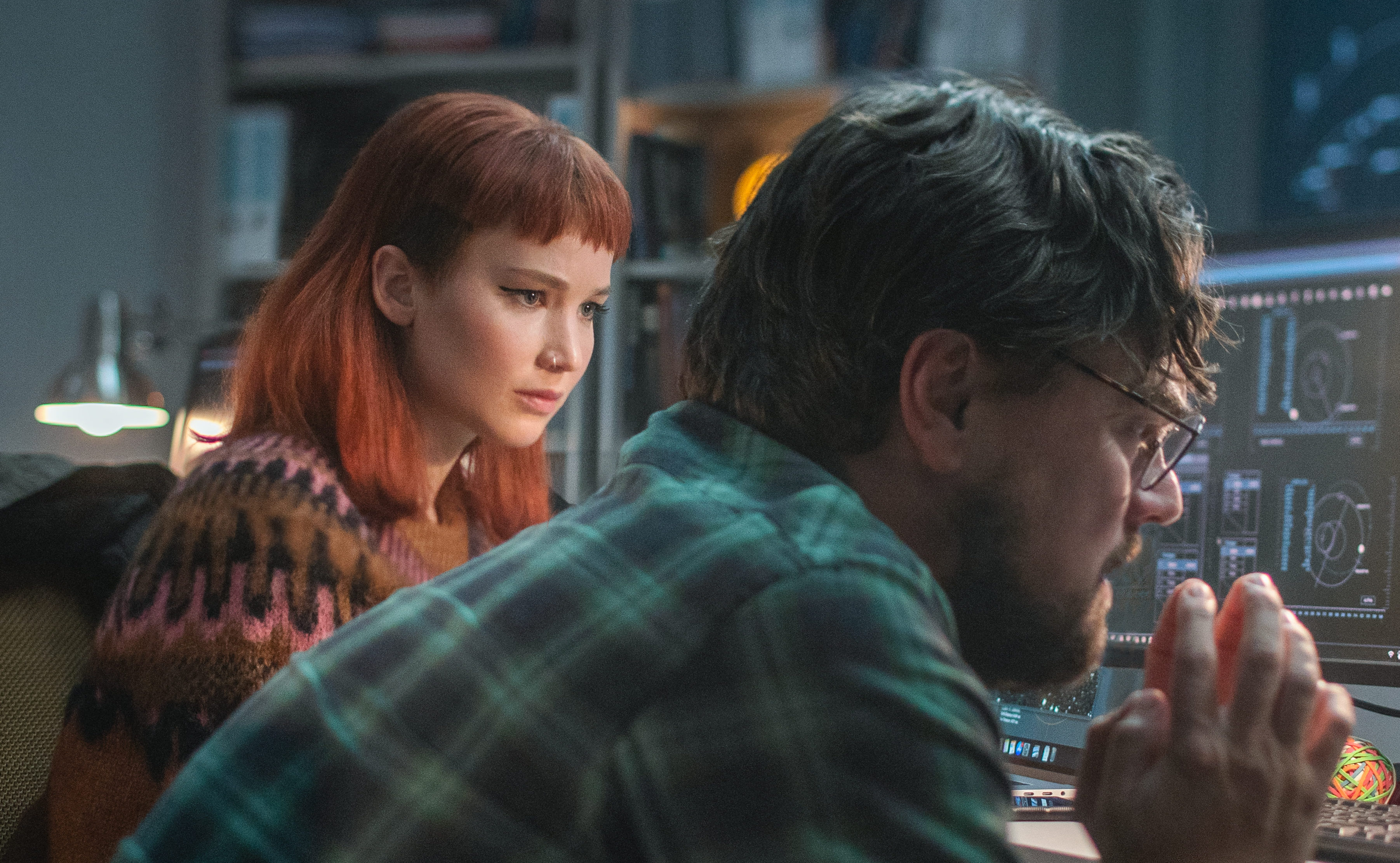 The movie stars Leonardo DiCaprio and Jennifer Lawrenc e as a professor and a grad student respectively who discover that a comet is on a direct collision course with Earth. The movie stars Leonardo DiCaprio and Jennifer Lawrenc e as a professor and a grad student respectively who discover that a comet is on a direct collision course with Earth. Ariana Grande is one of the many stars in a new Netflix movie called Dont Look Up she appears briefly in the trailer thats just dropped.