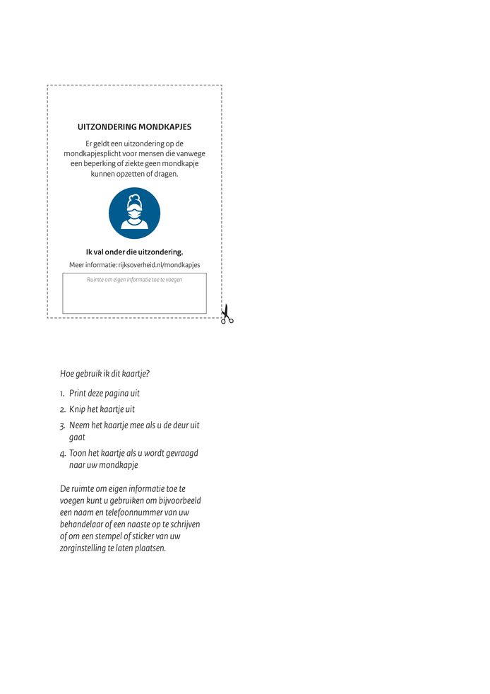 Kaartje voor uitzondering op mondkapjesplicht card for exemption from the requirement to wear a face mask if they are asked to do so for example by a supervisor or enforcement officer. Ook mensen die wegens een beperking of ziekte geen mondkapje kunnen dragen zijn de uitzondering op de regel. Er is ook een factsheet uitzondering mondkapjesplicht gemaakt die bedoeld is voor winkelpersoneel handhavers etc.